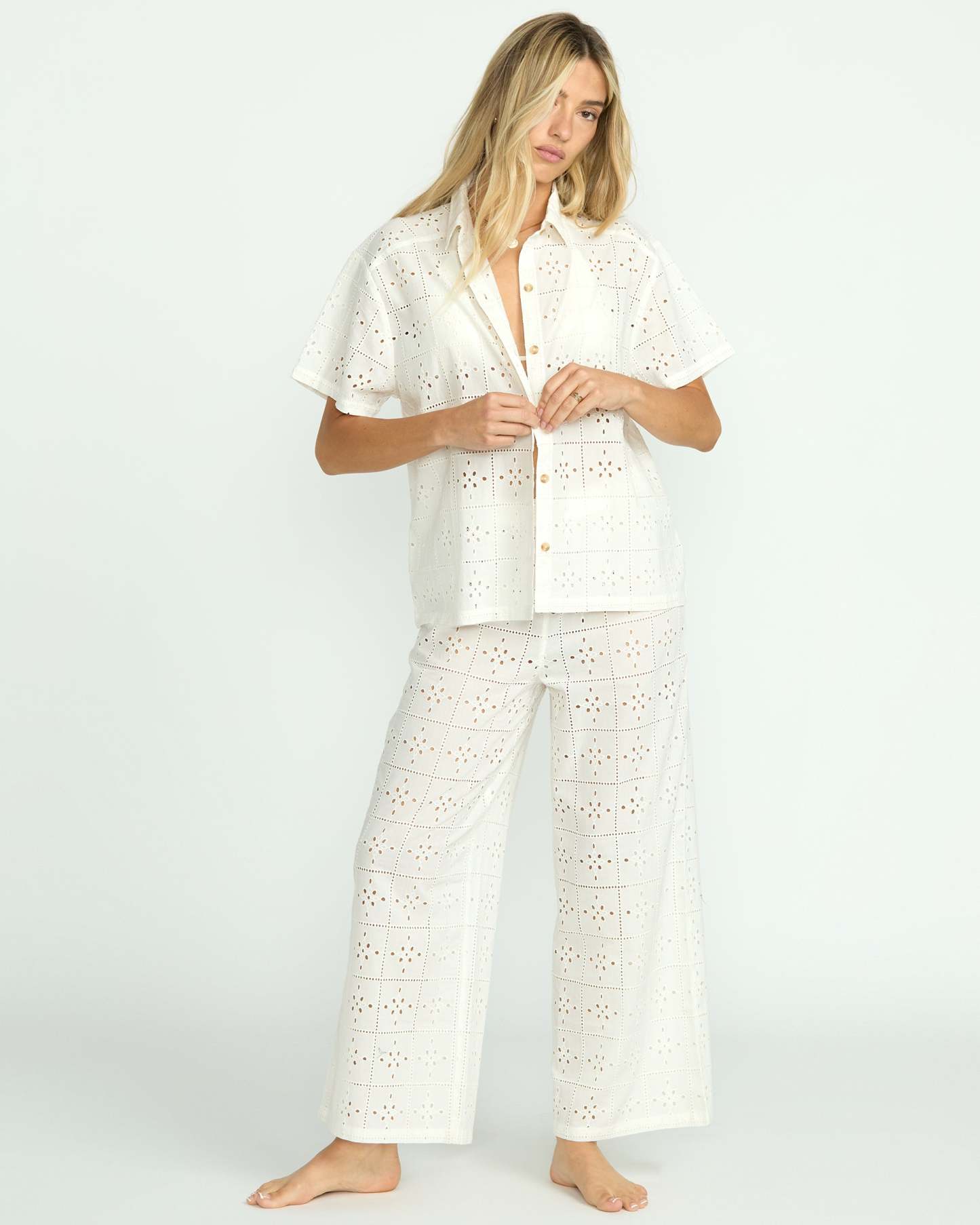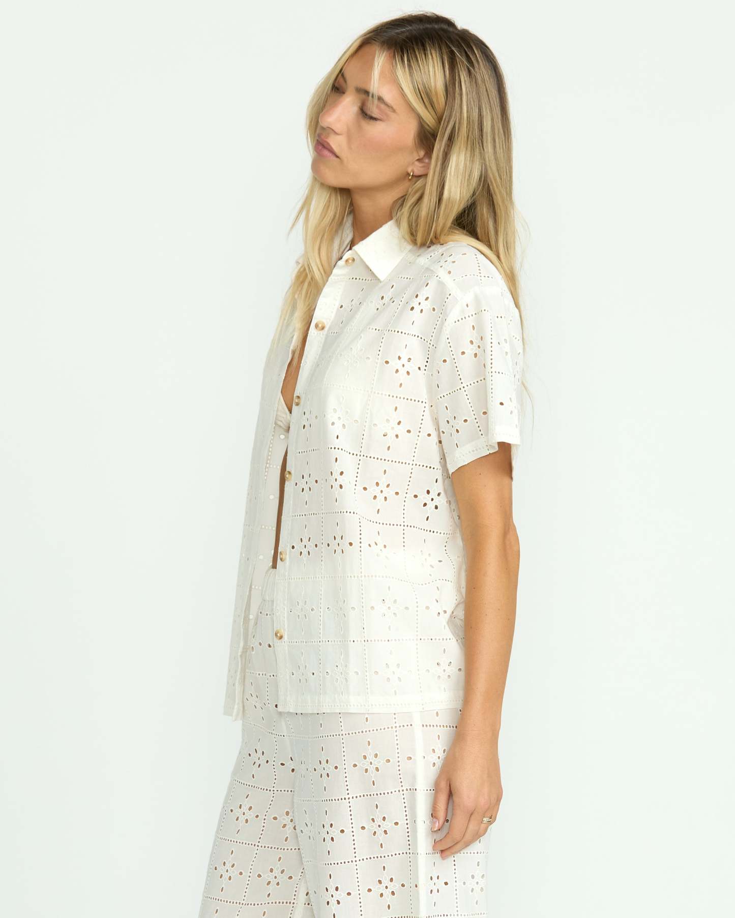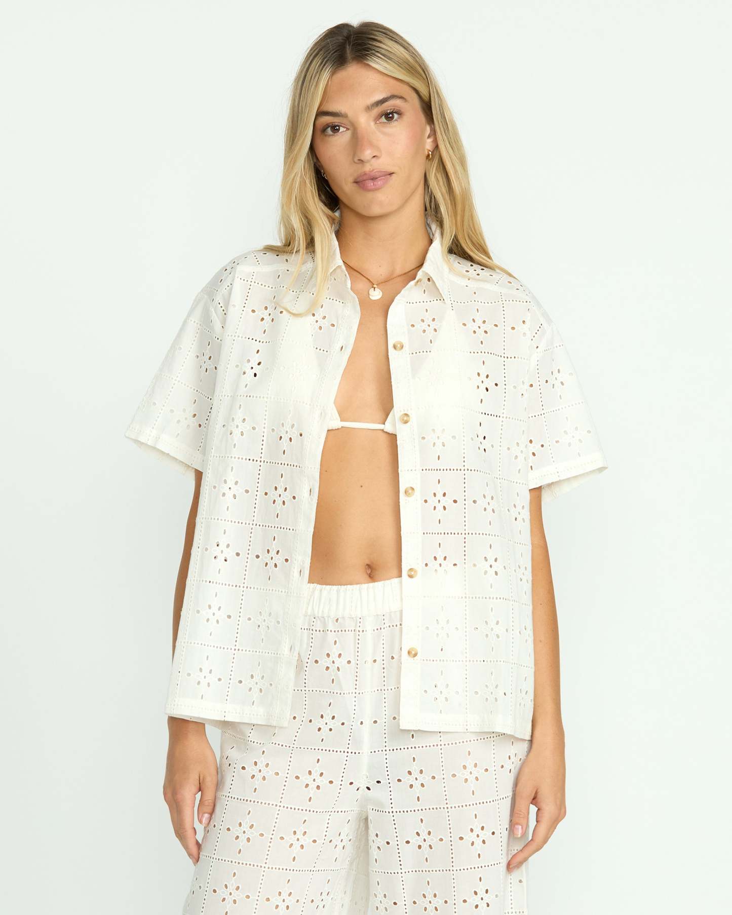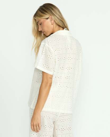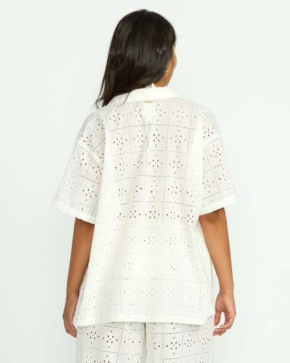 Our 100% cotton eyelet coverup top is oversized bliss. With short sleeves and a button-down closure, breezy yet structured, this women's shirt is ultra-lightweight, breathable perfection to throw on over swimwear or keep cool in casual style. In crisp white eyelet, it's a breath of fresh air.