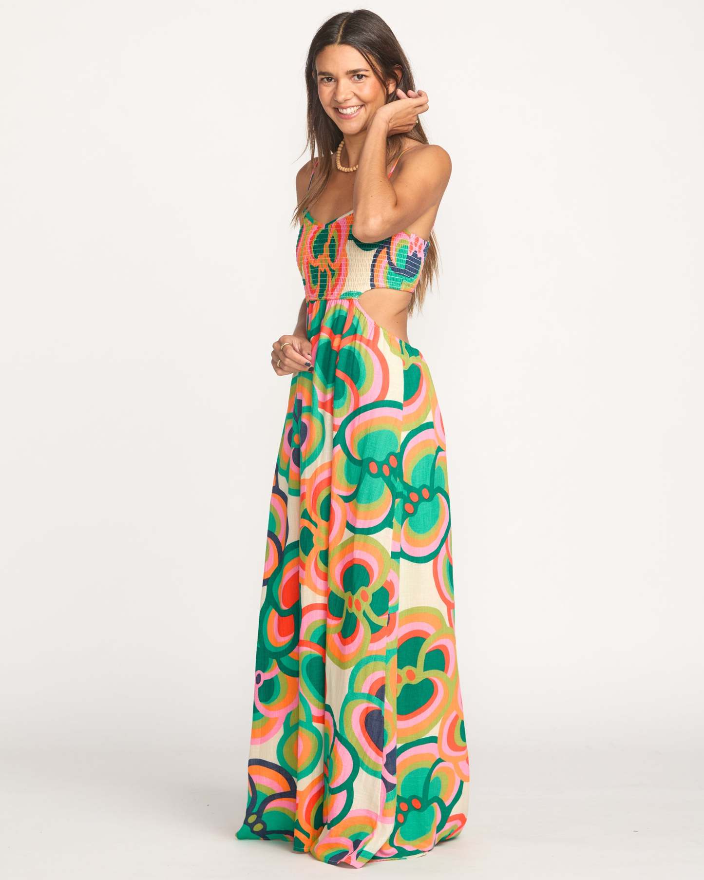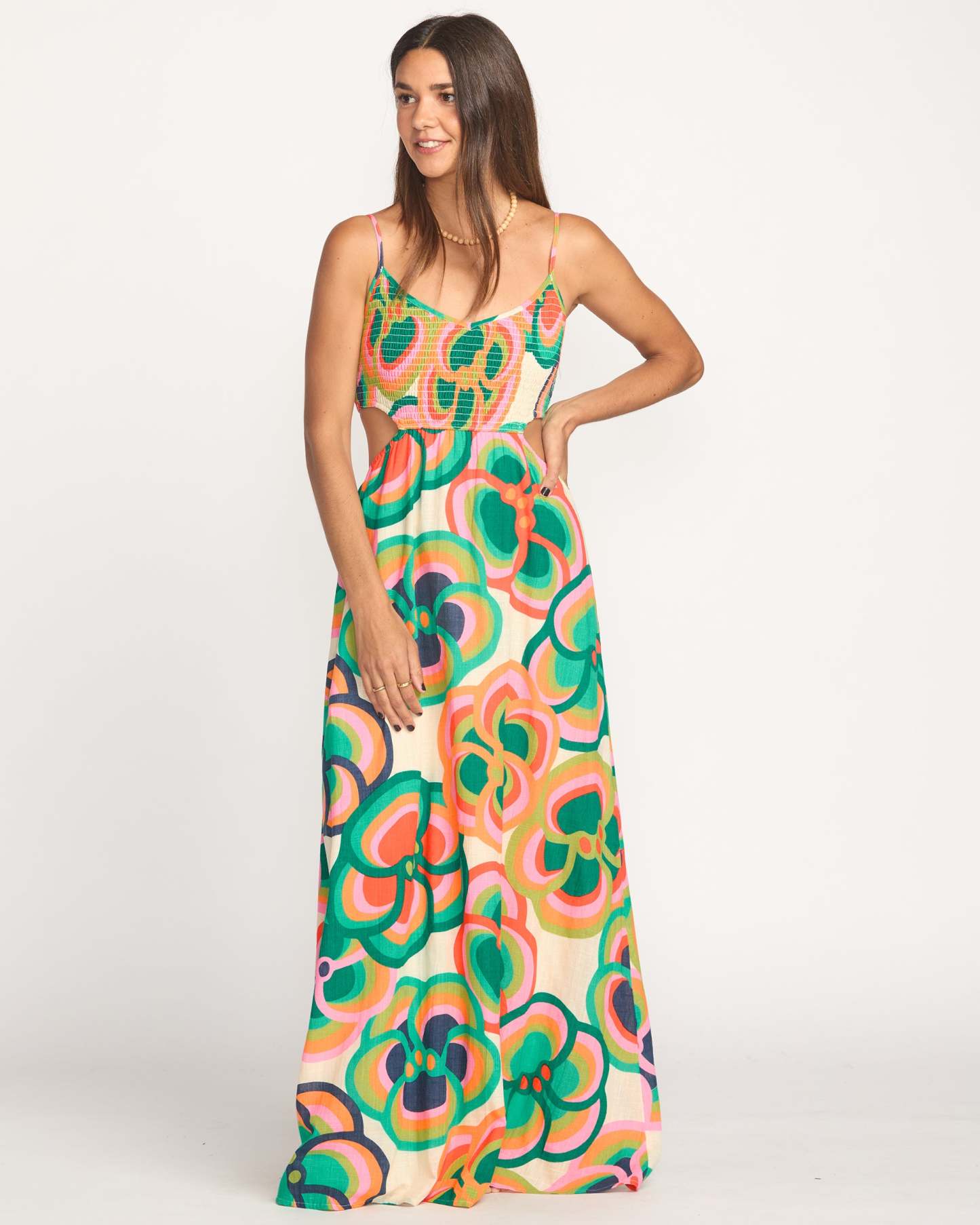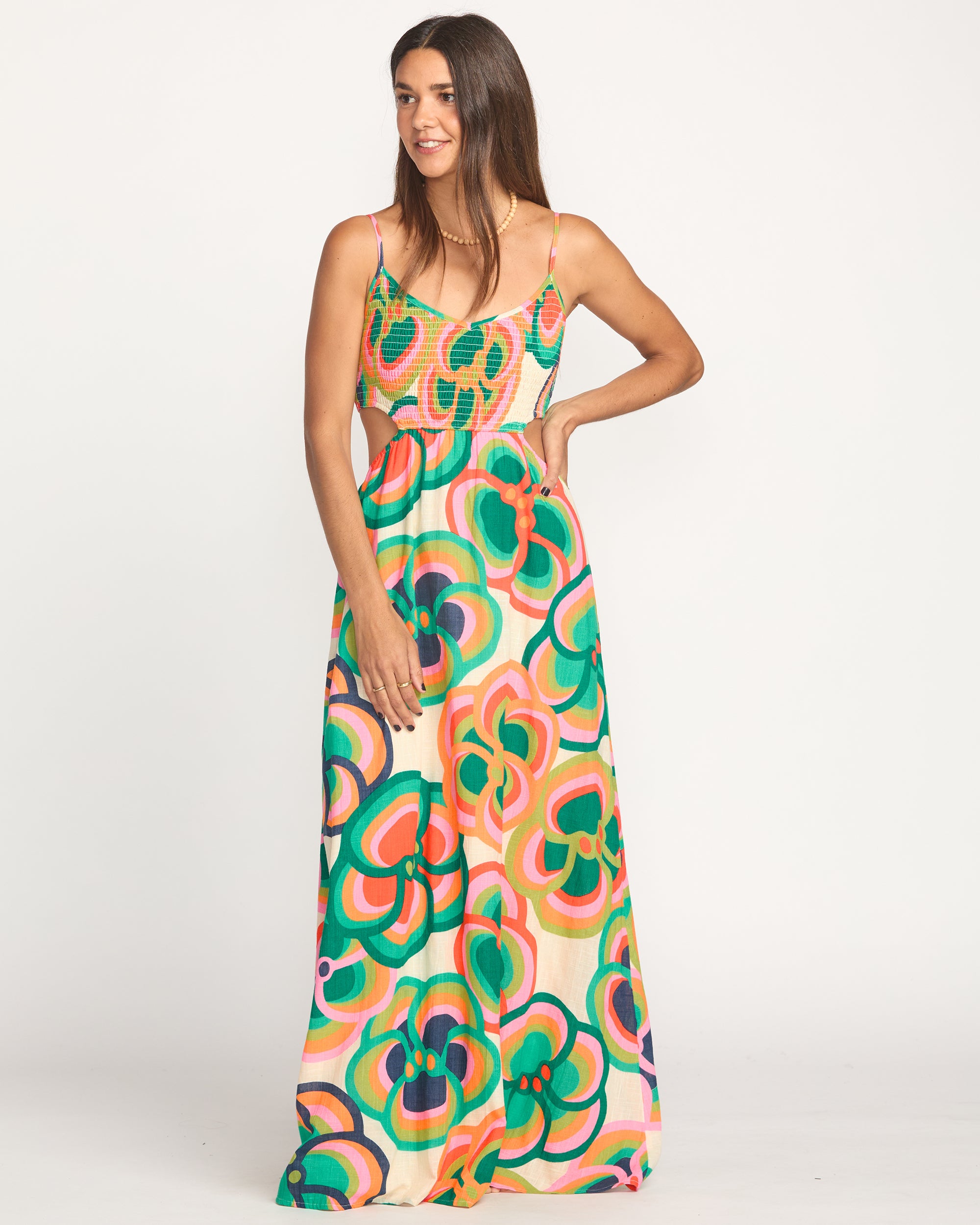 - V-neck, smocked bodice, cut-out detail at side seam