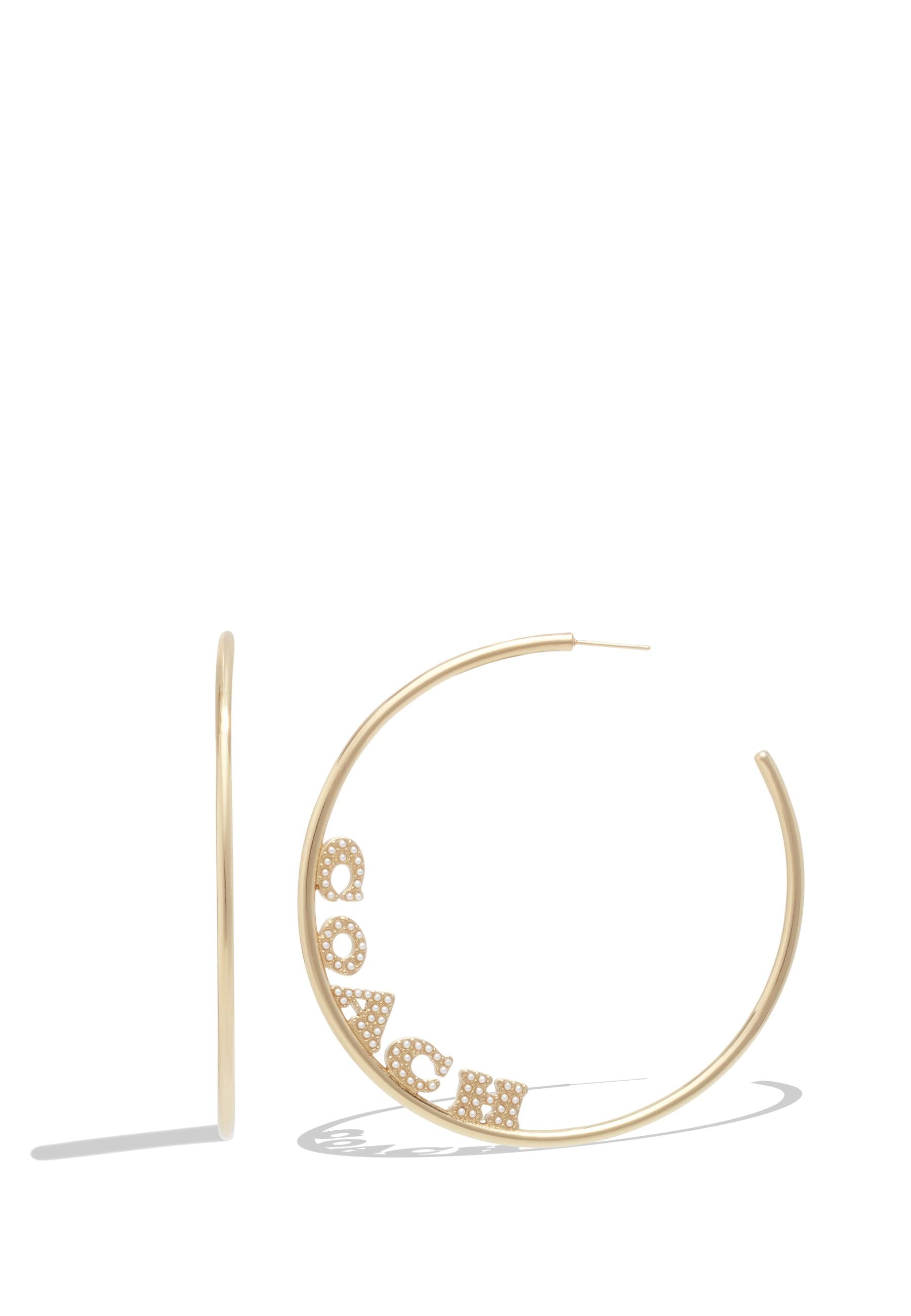 Sleek large-sized open hoop earrings featuring signature logo adorned with mini pearls. Earrings have a post back closure. Made from polished brass and glass pearl. Includes COACH pouch.