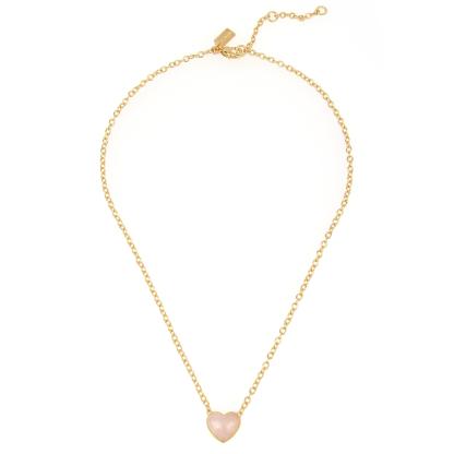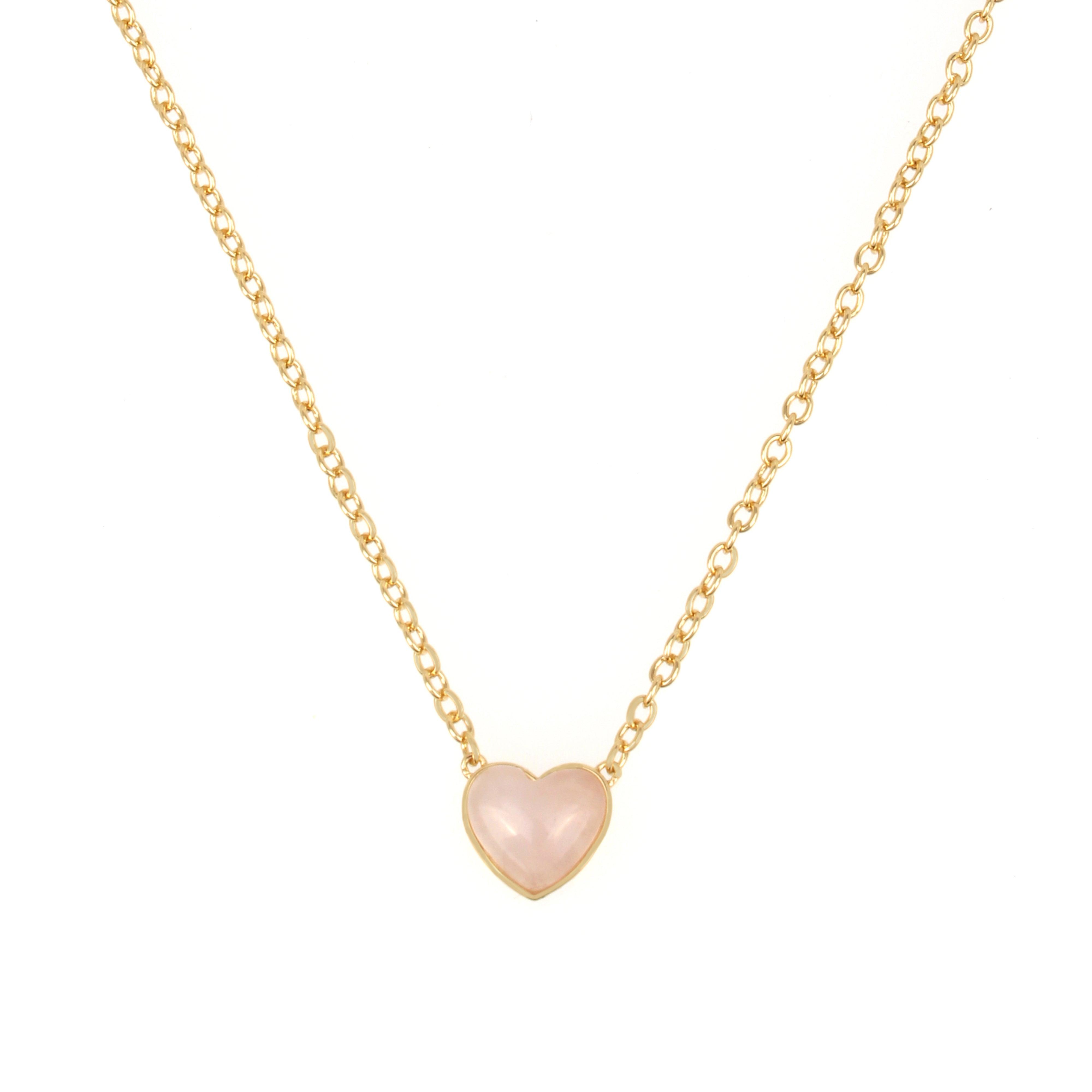 Semi-precious dyed rose quartz carved stone heart short pendant. This necklace is set in gold-tone metal and has an adjustable lobster clasp closure. Made from polished brass and semi-precious quartz.