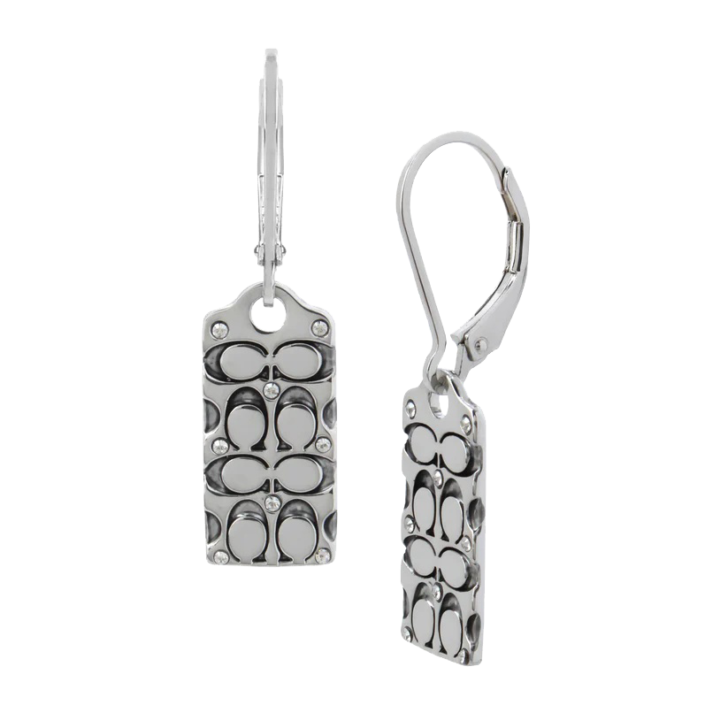 Drop earrings featuring tag with quilted signature sculpted C motif and delicate stone accents. Earrings have a lever back closure. Made from polished metal and glass crystal. Includes COACH pouch.