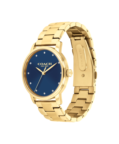 The Grand is inspired by the effortless style of New York, the city Coach has always called home. Crafted with a 36mm gold finsh case, blue dial and a gold finish bracelet