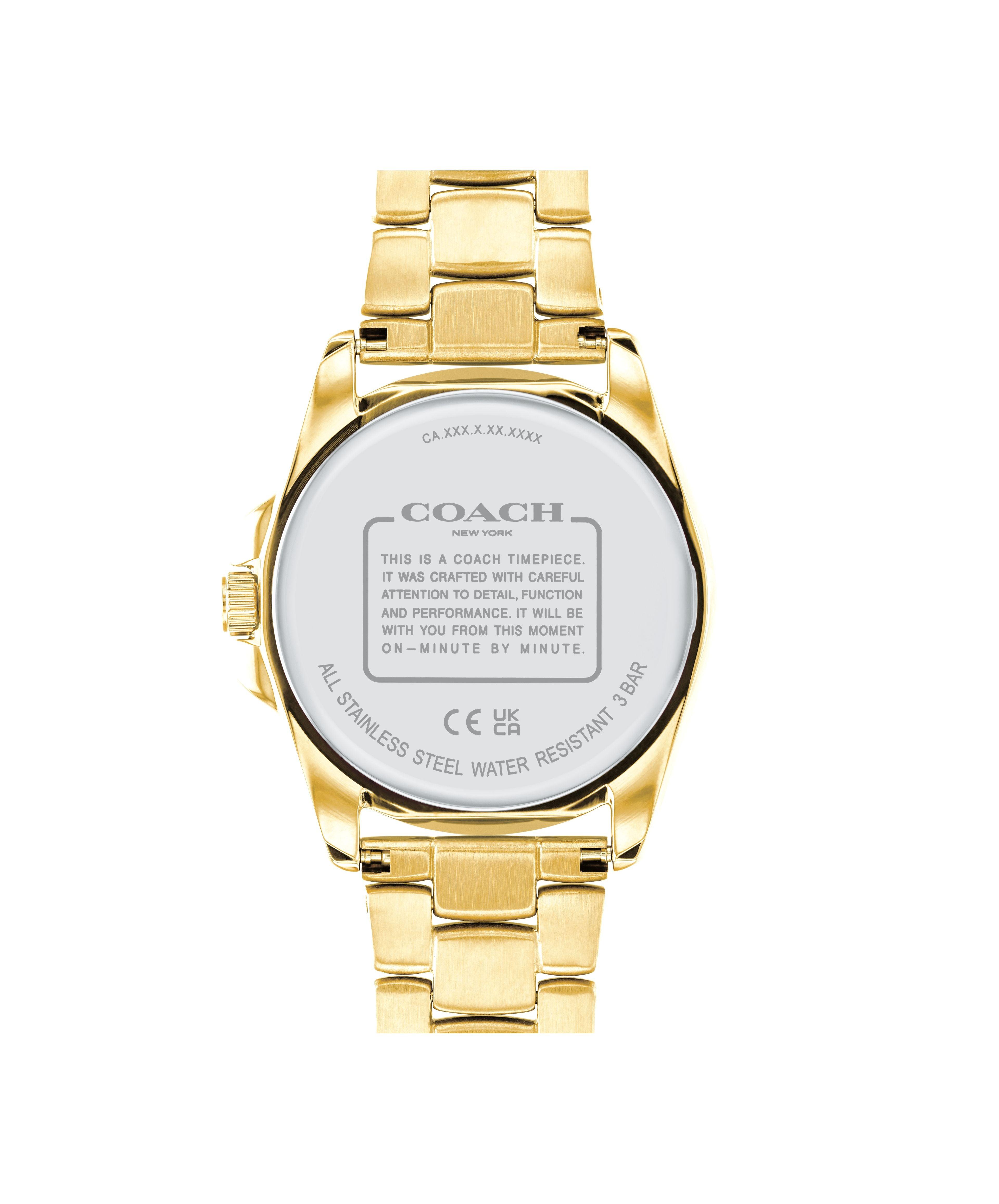 The epitome of refined sophistication, Greyson is a polished, go-everywhere timepiece. The sleek gold tone bracelet design sparkles with a crystal bezel and features a luminous mother-of-pearl dial detailed with Coach Tea Rose markers for an iconic touch.