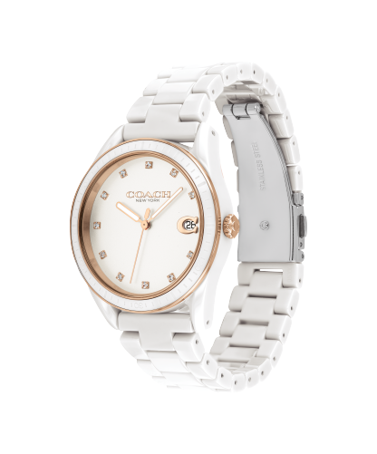 The Preston watch is an elegant pick for everyday. Crafted of white lightweight and scratch-resistant ceramic, it has a sleek lacquer dial finished with crystal markers and the Coach Signature.